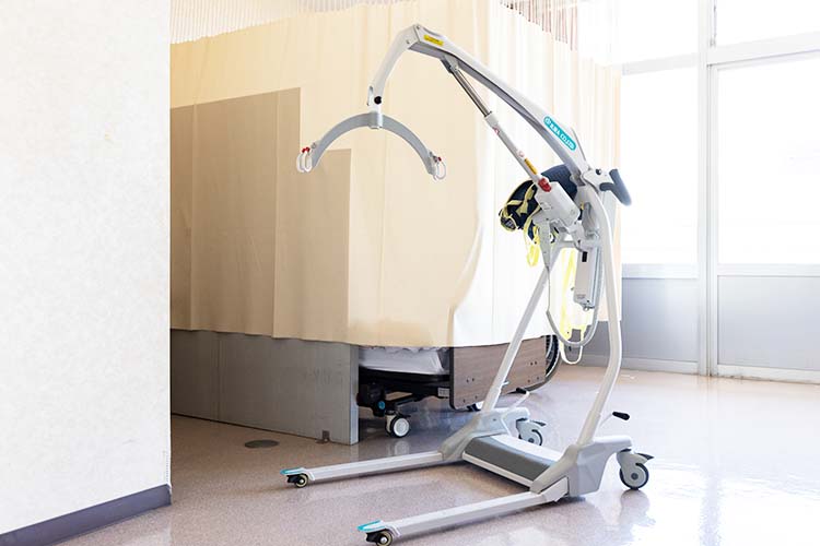 腰痛対策のため移乗用リフトや、インカム、LINEWORKS(報告、連絡の共有とIOTの活用)、センサーコールによる利用者の訴えの可視化し、スタッフが稼働しやすい環境です。